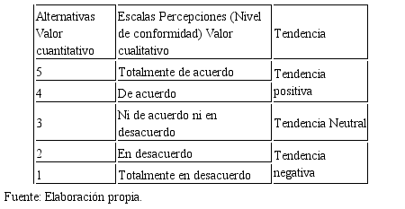 Basado en el baremo del cuadro 1, los resultados de la investigación, se presentan 3 tendencias, la tenencia positiva conformada por las respuestas totalmente de acuerdo y de acuerdo; la tendencia neutral conformada por la alternativa de respuesta indeciso y la tendencia negativa conformada por las alternativas de respuesta totalmente en desacuerdo y en desacuerdo.