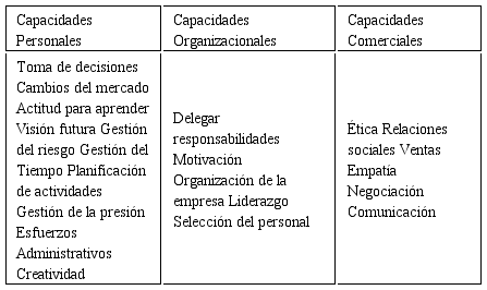 Para ello se consideraron las competencias desde la concepción de Veciana (1999) y clasificación por naturaleza de González (2004) y complementariamente se abordaron las tres, a saber: las capacidades personales desde la perspectiva Sáenz y López (2015) y Gareth y Crozier (2004); capacidades organizativas desde las perspectivas de Winter (2000) y Alles (2008), Fernández (2011) y capacidades comerciales desde la visión de de Schnarch (2014), Belzunce, et al. (2011), Hernández (2000) y Porter (1991), entre otros. (Error 1: La referencia: Veciana (1999) está ligada a un elemento que ya no existe) (Error 2: La referencia: Sáenz y López (2015) está ligada a un elemento que ya no existe) (Error 3: La referencia: Winter (2000) está ligada a un elemento que ya no existe) (Error 4: La referencia: Schnarch (2014) está ligada a un elemento que ya no existe)