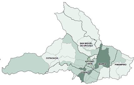 La Figura a la izquierda muestra la zonificación por CUT de la provincia de Imbabura, mientras que la de la derecha, la PEA a nivel parroquial. Claramente puede verse lo complejo que resultaría asignar valores de la PEA a las áreas de color naranja por ejemplo, cuya ubicación es asimétrica y dispersa y cubre segmentos de varias parroquias. Además de que resultaría ineficiente, dado el caso que ya se tiene la misma información a nivel parroquial.