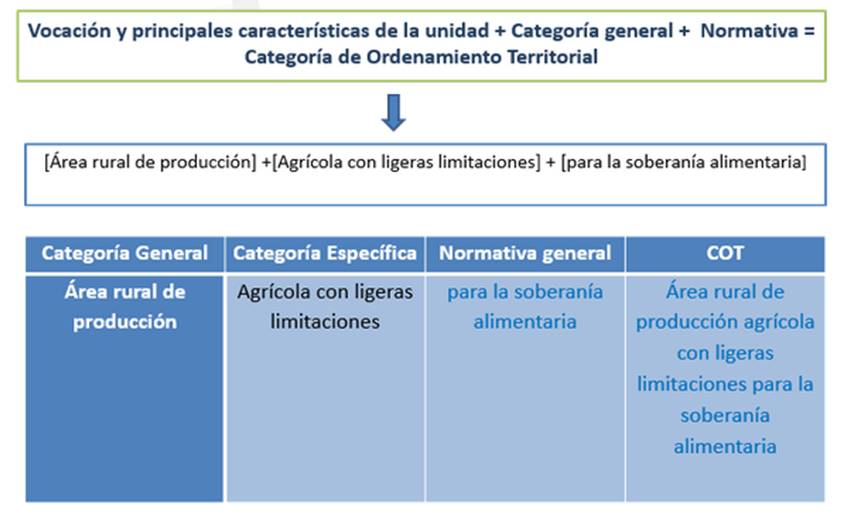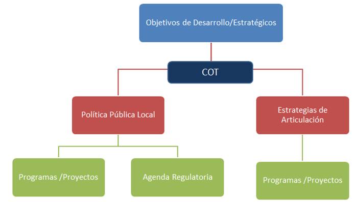 Dentro de la fase de propuesta, las Categorías de Ordenamiento Territorial son el eje que articula tanto los objetivos como las políticas públicas, y en general, a través del Modelo Territorial Deseado, toda la propuesta de desarrollo de los GAD. Esquemáticamente, según la metodología de SENPLADES, las COT se definen tal como se presenta en la Figura 2. Sobre su elaboración se menciona: