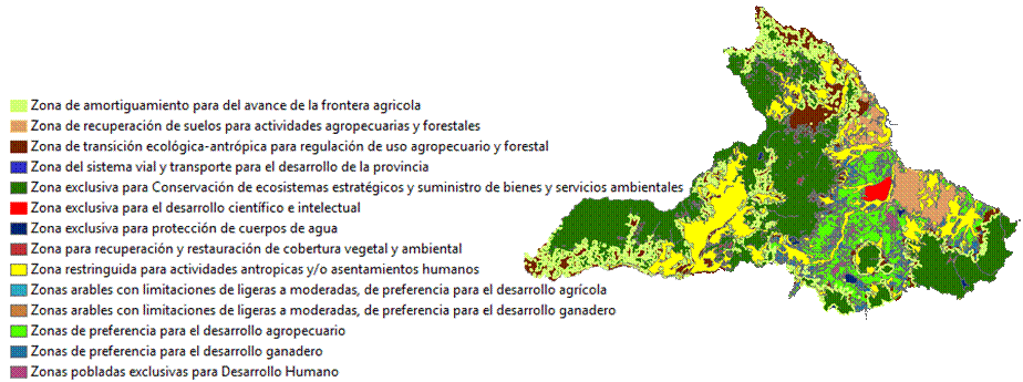 La Figura 3 muestra las Categorías de Ordenamiento Territorial definidas en la provincia de Imbabura. Se aprecia en las categorías descritas la inclusión de variables que permiten una clasificación más completa. Esto permite una categorización ligada no únicamente a condiciones de capacidad de uso de la tierra, sino a los objetivos de desarrollo que se buscan como territorio.