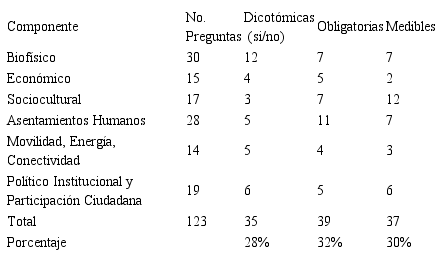 Sobre las 123 preguntas se desprende lo siguiente: solo un 30% corresponde a preguntas mensurables, es decir, que admiten una variable numérica. La gran mayoría son preguntas dicotómicas de respuesta Si/No, cuya información no garantiza la posibilidad de análisis profundos. Se pregunta por ejemplo: ¿existe infraestructura de apoyo a la producción? Tal cuestionamiento no permite conocer si la infraestructura es adecuada, es suficiente, si es asequible de manera equitativa, etc.[3] No todas las preguntas tienen respuesta obligatoria. La Tabla 2 muestra un diagnóstico general de las preguntas ingresadas en el sistema.
