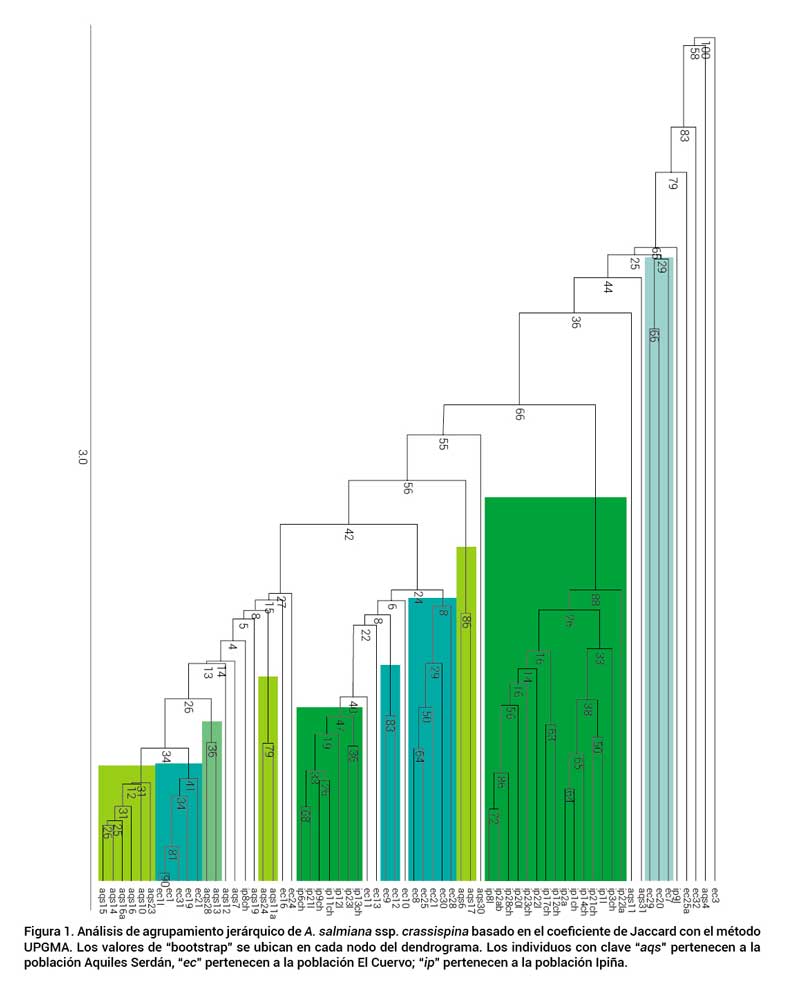 Algunos nodos del dendrograma muestran valores significativamente altos de “bootstrap”, mientras que otros nodos mostraron valores bajos. Esto puede explicarse por el alto grado de polimorfismo de los marcadores que apoyan la aparición de esos nodos con bajo valor de “bootstrap” en las tres poblaciones de A. salmiana ssp. crassispina; sin embargo, la topología general del árbol es más informativa que una rama en particular (Figura 1) (Mohammadi y Prassana, 2003).