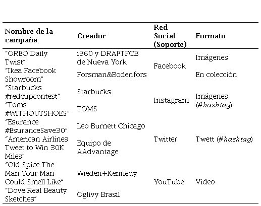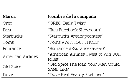 Se realizó un estudio exploratorio de caso donde se analizaron las campañas publicitarias de las siguientes redes sociales: Facebook, Instagram, Twitter y YouTube dentro de un rango de 10 años. Se analizó la información de dichas campañas que tuvieron alto grado de viralización que se detallan en la Tabla 1. En el estudio se escogieron las siguientes marcas con sus respectivas campañas: