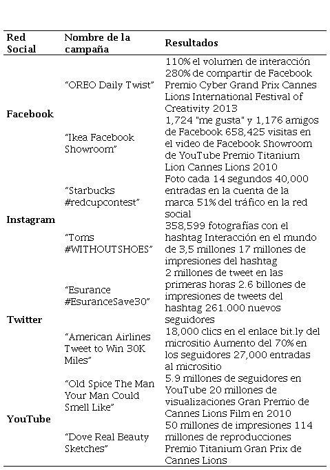 La campaña que consiguió mayor interacción en Facebook fue la campaña “OREO Daily Twist” que obtuvo una gran notoriedad positiva de marca del 2012, y la que ganó gran atención de los medios fue la campaña “Ikea Facebook Showroom”. En Instagram “Starbucks #redcupcontest” genero un gran tráfico en la red social y “Toms #WITHOUTSHOES” consiguió la participación de usuarios en más de 30 países. En Twitter “Esurance #EsuranceSave30” aumentó por 12 el pico de visitas que había tenido la empresa hasta el lanzamiento de la campaña y “American Airlines Tweet to Win 30K Miles” obtuvo más de 27,000 entradas el micrositio Deal 30 creada especialmente paraesta promoción. Por último, en YouTube “Old Spice The Man Your Man Could Smell Like” fue el video más visto de todos los tiempos en un branded channel de esta red social y “Dove Real Beauty Sketches” fue el tercer anuncio más compartido de todos los tiempos hasta ese momento.