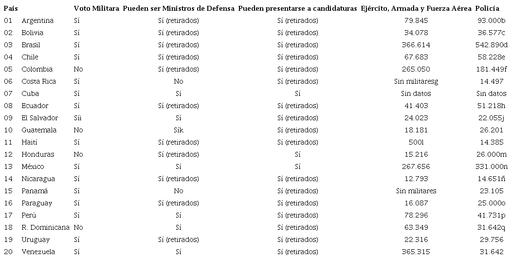 De 16 países analizados, 12 permiten el voto militar, incluidos todos los del Cono Sur (Argentina, Uruguay, Chile, Paraguay y Brasil). En general, sus experiencias no muestran aumentos en la politización de las Fuerzas Armadas. En Argentina, por ejemplo, el voto militar no apoyó a Cristina Kirchner en las elecciones de 2011 y sin embargo durante su mandato no se han presentado manifestaciones de des- obediencia castrense. (Rudas, 2014).