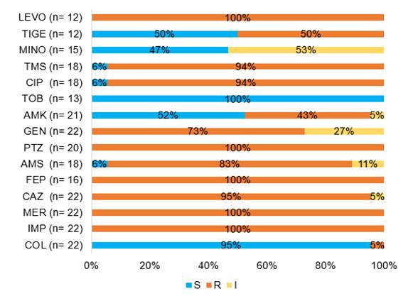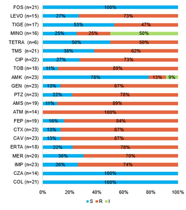 FOS, fosfomicina; LEVO, levofloxacina; TIGE, tigeciclina; MINO, minociclina; TETRA, tetraciclina; TMS, trimetoprima sulfametoxazol; CIP, ciprofloxacina; TOB, tobramicina; AMK, amicacina; GEN, gentamicina; PTZ, piperacilina tazobactam; AMS, ampicilina sulbactam; ATM, aztreonam; FEP, cefepime; CTX, cefotaxima; CAV, ceftazidima; ERTA, ertapenem; MER, meropenem; IMP, imipenem; CZA, ceftazidima avibactam; COL, colistín.