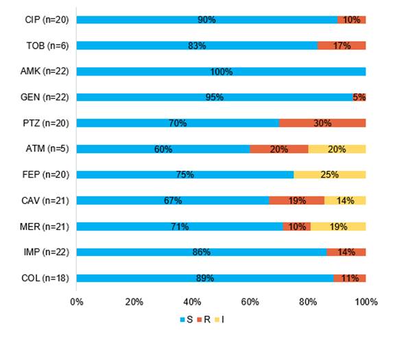 CIP, ciprofloxacina; TOB, tobramicina; AMK, amicacina; GEN, gentamicina; PTZ, piperacilina tazobactam; ATM, aztreonam; FEP, cefepime; CAV, ceftazidima; MER, meropenem; IMP, imipenem; COL, colistín.