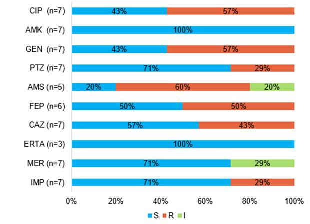 CIP, ciprofloxacina; AMK, amicacina; GEN, gentamicina; PTZ, piperacilina tazobactam; AMS, ampicilina sulbactam; FEP, cefepime; CAV, ceftazidima; ERTA, ertapenem; MER, meropenem; IMP, imipenem.