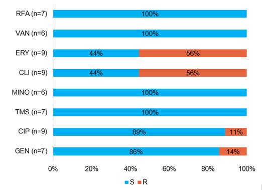 RFA, rifampicina; VAN, vancomicina; ERY, eritromicina; CLI, clindamicina; MINO, minociclina; TMS, trimetoprima sulfametozaxol; CIP, ciprofloxacina; GEN, gentamicina.