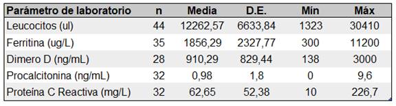 Se analizaron también cuáles fueron los valores de los parámetros bioquímicos de leucocitos, ferritina, dímero D, procalcitonina y proteína C reactiva. En la tabla III, se pueden observar cuántas muestras se analizaron de cada parámetro y cuáles fueron los valores promedio, máximos y mínimos de cada uno.