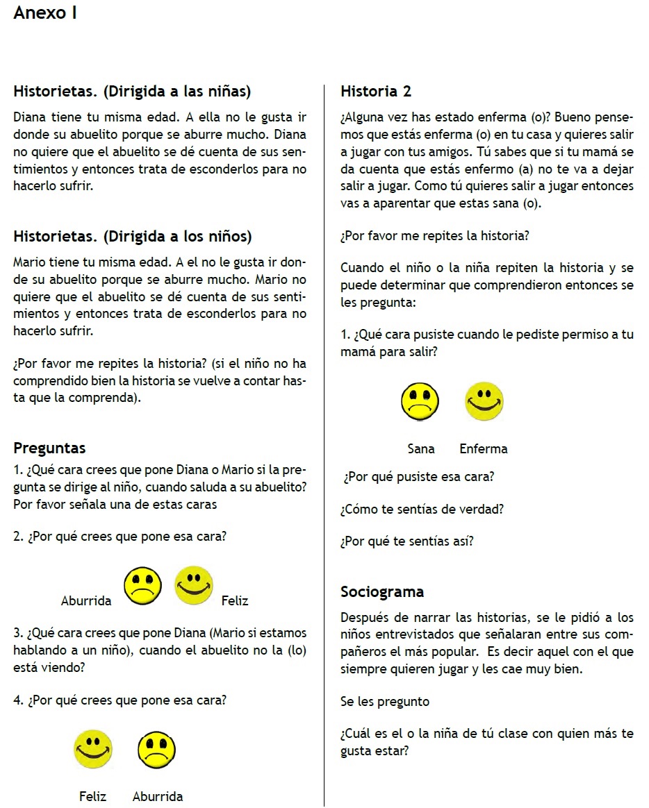 El procedimiento consistió en ubicar al niño en el aula de clase, y de forma individual explicarle el procedimiento y aplicarle los instrumentos. La primera historia hacía referencia a una emoción aparente negativa en la que el protagonista era un niño o niña de su misma edad y la otra hacía referencia a una emoción aparente positiva en la que ellos eran los protagonistas (Ver anexo 1) . Los niños escuchaban cada historia y luego debían repetirla para saber si la habían comprendido bien. En caso de tener errores de comprensión, se les volvía a leer, hasta que la comprendieran completamente.