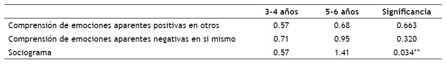 El análisis segmentado por edades permitió determinar que los niños de 4 años con AI comprendían peor las emociones aparentes negativas en sí mismos (M = 0.20) que los niños de 5 años con AI (M = 0.75). Estas diferencias fueron estadísticamente significativas. Por el contrario, el grupo de niños con OP no presentó diferencias significativas en ninguno de los dos tipos de comprensión de emociones aparentes ni en la variable popularidad. Sin embargo, es importante resaltar que del grupo de niños con OP, los niños de 4 años obtuvieron una puntuación mayor que los de 5 años en la comprensión de emociones positivas en terceros. En el grupo de niños sin AI/OP tampoco se presentaron diferencias entre los grupos de edades respecto a la comprensión de emociones aparentes positivas o negativas. En la tabla 5 se muestran los promedios obtenidos por los niños de 3-4 años en la comprensión de emociones aparentes positivas y negativas y en el nivel de popularidad. Aún cuando existen diferencias entre los grupos, estas no fueron significativas.