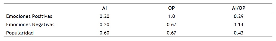 Fuente: elaboración propia.En la Tabla 3 se presenta la tendencia de los promedios de los tres grupos respecto a la comprensión de emociones aparentes negativas en sí mismos. Una segunda hipótesis consideraba que los niños con AI tendrían un alto nivel de popularidad dentro de su grupo de compañeros. Los resultados muestran que los niveles de popularidad de los niños no fueron elevados si se tiene en cuenta que la puntuación máxima obtenida por uno de los niños fue 5. El promedio más bajo fue obtenido por el grupo de niños con OP como se observa en la Tabla 3.