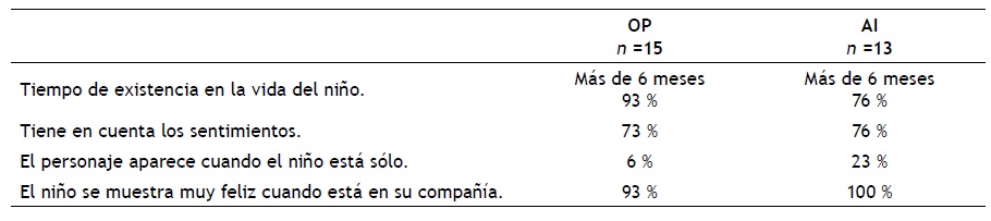 Fuente: elaboración propia.Como un tercer nivel de análisis se determinaron algunos aspectos de las relaciones de los niños con su AI o con su OP partiendo de las descripciones realizadas por sus padres. De forma general se encontró que la mayoría de los niños disfrutan de la relación con sus AI u OP, los tratan como si en realidad tuvieran sentimientos y toman en cuenta lo que podrían sentir en ciertas circunstancias. La duración de esta relación suele variar entre 6 meses y un año.