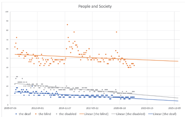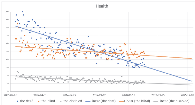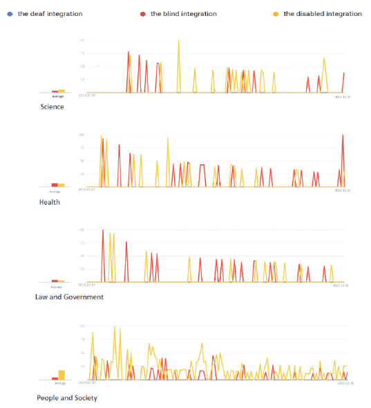 Next, for comparative testing purposes, we analysed the level of users’ interest in terms of “the deaf integration”, “the blind integration” and “the disabled integration” in categories of Science, Health, Law and Government, and People and Society within the period of Covid-19 pandemic restrictions (Figure 8).