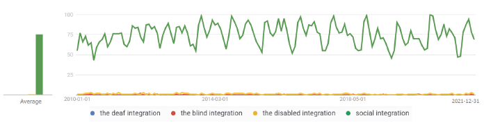 Figure 9. Google users’ interest in the terms “the deaf integration”, “the blind integration”, and “the disabled integration”, and “social integration”, all the categories, 2010-2021.Source: the authors’ compilation by using Google Trends.