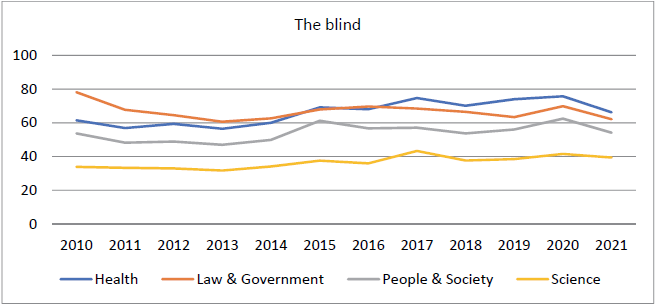 Figure 2. Google users’ interest in the terms of the blind in sections of Health, Law and Government, People and Society, and Science (2010-2021).Source: the authors’ compilation by using Google Trends.