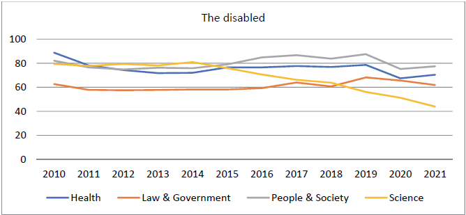 Figure 3. Google users’ interest in the terms of the disabled in sections of Health, Law and Government, People and Society, and Science (2010-2021).Source: the authors’ compilation by using Google Trends.