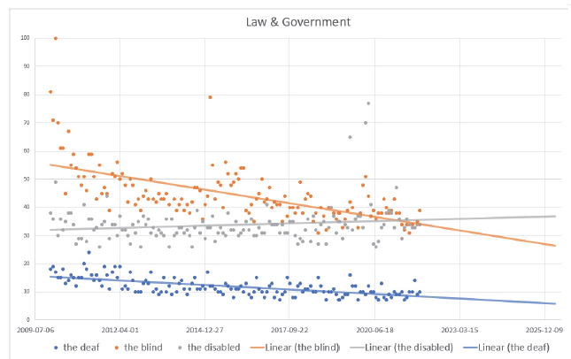 Figure 5. Google users’ interest in the terms “the deaf”, “the blind”, and “the disabled”, Law and Government section.Source: the authors’ compilation by using Google Trends.