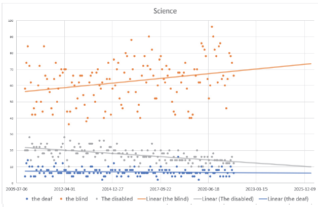 Finally, we analysed data related to users’ interest in the term the disabled. The trend shows a steady decline in user interest in the disabled, in Science category since 2014 (Figure 3).