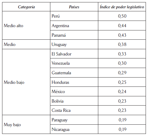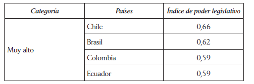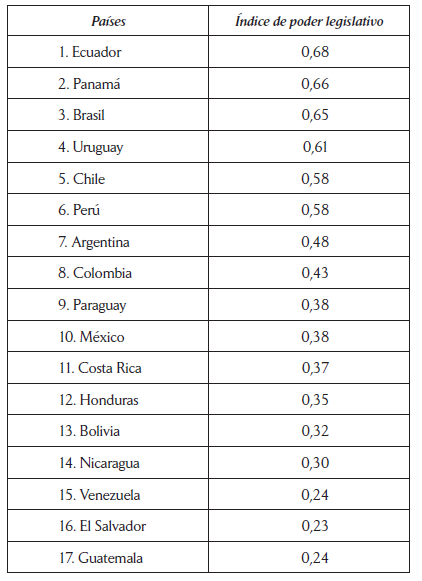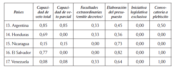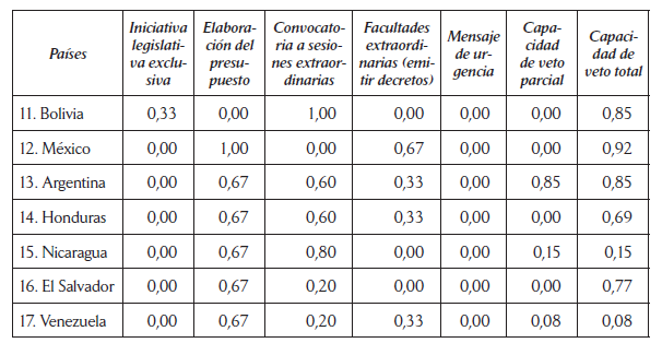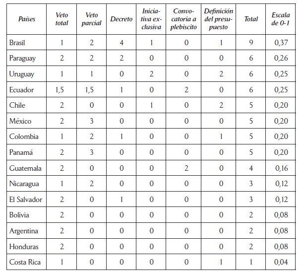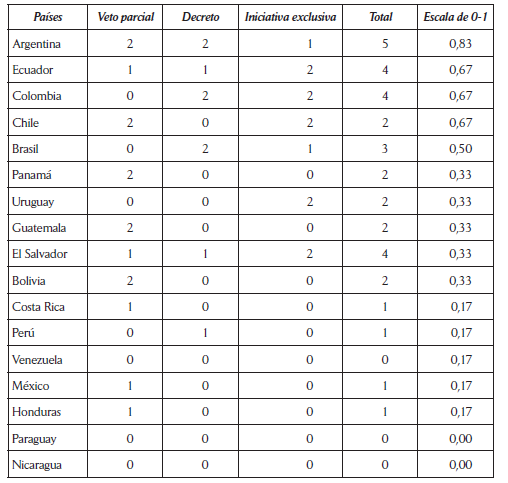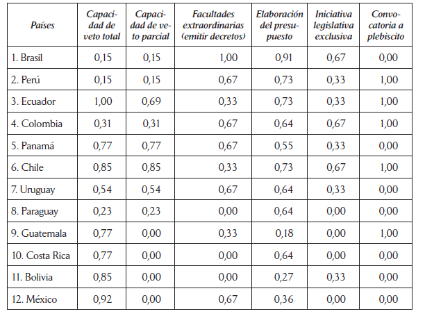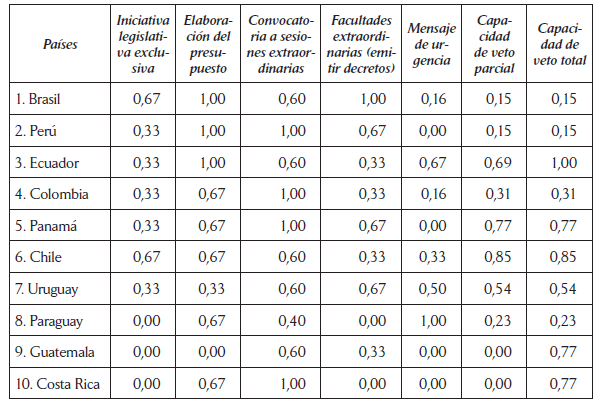 De igual forma que las ponderaciones planteadas por el PNUD (2005) y por García Montero (2009), los países en los que los presidentes cuentan con más poderes legislativos en su conjunto son Ecuador, Panamá, Brasil, Uruguay, Chile y Perú, que suelen ser incluidos como casos de poderes legislativos medio alto o muy altos.