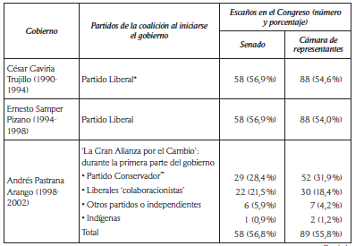 Durante el gobierno de Andrés Pastrana (1998-2002), se conformó la coalición Gran Alianza por el Cambio, que incluyó a los distintos movimientos internos del partido Conservador,10 a un sector de congresistas liberales autodenominados colaboracionistas y a congresistas independientes, incluso un indígena. Se trató de una débil alianza de carácter transaccional que se mantuvo durante el primer periodo de la Presidencia y gradualmente se fue desdibujando. Incluso, en momentos álgidos en que proyectos del ejecutivo requirieron apoyo en el Congreso, no contó con este (los casos más sobresalientes fueron la frustrada reforma política de 2003 y el proyecto de referendo que propuso el presidente y que no logró su aprobación en el Congreso). Este fue un lapso de gran desprestigio del Congreso, debido a los comprobados vínculos de muchos congresistas con el narcotráfico, que condujo a decenas de procesos de pérdida de investidura y al encarcelamiento y condena de muchos senadores y representantes, y al escándalo de corrupción que implicó al presidente y vicepresidentes de la Cámara de Representantes, quienes fueron condenados por delitos de cohecho y concierto para delinquir.11