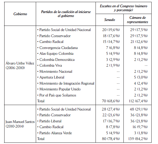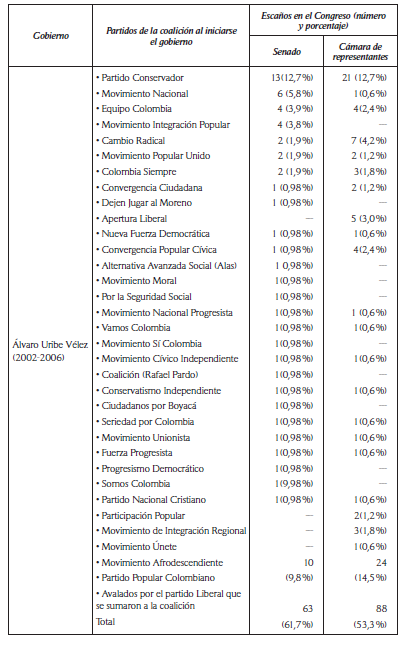 Desde las elecciones de 2002, los partidos Liberal y Conservador se empezaron a dividir y el candidato liberal disidente Álvaro Uribe Vélez conformó una coalición de diversos sectores y partidos que le permitió ganar las elecciones. Tras la reforma política de 2003, surgieron muchos pequeños partidos por agregación de congresistas y más de 30 de estos se mantuvieron como cuerpo parlamentario del gobierno, un gobierno unificado a través de una coalición fabricada a través de incentivos selectivos con muchos pequeños partidos y sin que el presidente ejerciera la dirección o la influencia directa en ninguno de ellos. Los partidos Liberal y el de izquierda Polo Democrático Alternativo se mantuvieron en la oposición como minorías que eran derrotadas siempre en las votaciones. Un presidente fuerte, con algunas facultades constitucionales, que recurrió con frecuencia al estado de excepción y que debió manejar decenas de partidos a través de transacciones e intercambios. Estas mayorías aprobaron la reforma constitucional que estableció la elección presidencial (A. L. 1/05), apoyó a Uribe Vélez, quien ganó de forma holgada las elecciones de 2006, y, de nuevo, en 2009, aprobó la convocatoria a un referendo que permitiría cambiar otra vez las reglas para reelegir por un tercer periodo a Uribe Vélez. La Corte Constitucional lo declaró inconstitucional.