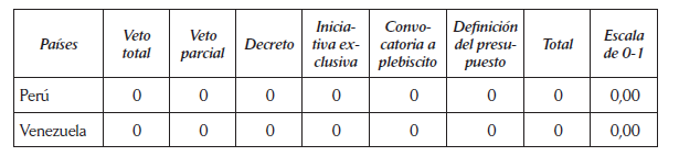 Poder de presupuesto: 4 = el presidente elabora el proyecto y el Congreso no puede modificarlo; 3 = el Congreso puede reducir pero no incrementar las partidas del presupuesto; 2 = el presidente impone el gasto total sin que la Asamblea pueda modificarlo; 1 = el Congreso puede incrementar las partidas solo si designa los nuevos recursos; 0 = el Congreso tiene completa autoridad para preparar o enmendar el presupuesto.