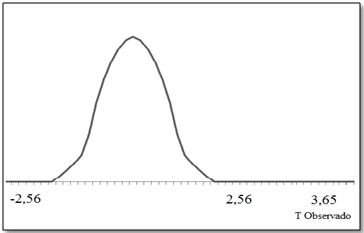 Nota-se que o T observado está fora do intervalo de Tcalc 2,56, o que considera a rejeição da hipótese nula, ou seja, a implantação do quadro conseguiu apoiar melhorias de desempenho na execução das tarefas do setor. A seguir é apresentado na Figura 4 o T observado fora do intervalo Tcalc: