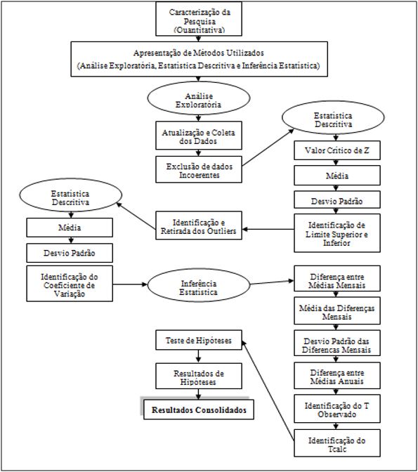 A Figura 3 apresenta o passo e passo da construção da metodologia: começando pela caracterização da tipologia da pesquisa; a abordagem metodológica e métodos utilizados coleta de dados; tratamento inicial dos dados, com a exclusão dos dados incoerentes; identificação e retirada dos outliers; formulação e testes de hipóteses; obtenção dos resultados das hipóteses e os resultados consolidados.