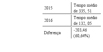 Por conseguinte, para a visualização mais abrangente dos resultados, foram comparados os tempos médios anuais de execução das tarefas de 2015 e 2016, somando-se os tempos totais de cada mês de determinado ano e dividindo pelo número de meses. Com isso, as médias anuais e a diferença entre elas são apresentadas na Tabela 3 a seguir: