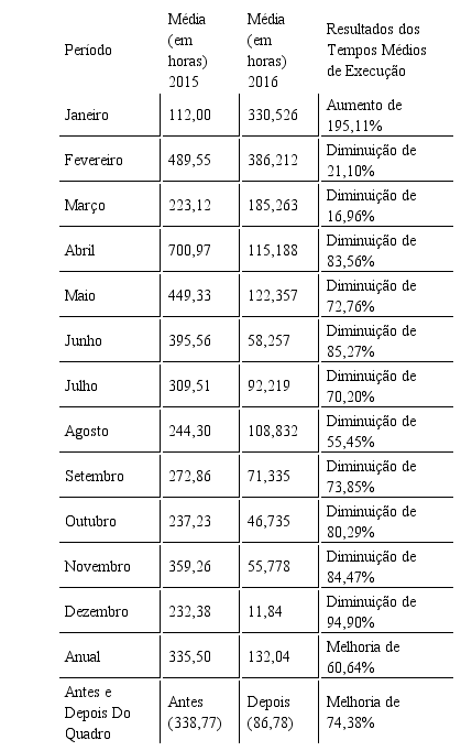 O resultado dessa diferença apresenta claramente o que ocorreu depois da implantação do quadro no setor: houve aproximadamente 60% de diminuição no tempo médio de realização das tarefas de 2016 em comparação com 2015. Ressalta-se que esse resultado de estabilidade pode ser atribuído ao controle visual do quadro.