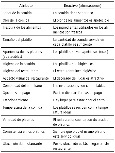 En relación con los reactivos para los atributos tangibles, en la tabla 7 se puede ver que convergen en nueve factores. Se obtienen siete factores unidimensionales donde se conjuntan reactivos de un solo atributo: opciones de pago, estacionamiento, temperatura de la comida, variedad de platillos, consistencia en el servicio, tamaño del platillo y ubicación del restaurante. Se obtiene un factor que agrupa los atributos frescura de los alimentos, higiene de la comida, olor de la comida, apariencia del platillo (apetecible) y sabor de la comida. Se genera un factor que conjunta a los reactivos de los atributos lo confortable del mobiliario y el aspecto del lugar. En el factor tamaño del platillo solo se cargan dos de los reactivos desarrollados para medir este atributo. Aunque aparecen cargas factoriales aisladas de algunos de los reactivos en otros factores, estas tienden a ser bajas (mostrando algunos problemas ligeros de separabilidad); en términos generales, se aprecia un resultado factorial con suficiente nitidez como para argumentar la validez tanto convergente como discriminante de los reactivos.