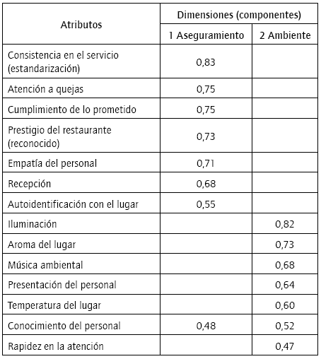 En la tabla 11 se muestra el resultado del análisis factorial para la subescala de atributos intangibles. Como se puede observar, se presenta una solución factorial con dos dimensiones: aseguramiento (cumplimiento) y ambiente. En la primera se agrupan principalmente aspectos básicos del servicio relacionados al personal. La segunda dimensión agrupa principalmente aspectos sobre el entorno como el olor, la música y la temperatura ambiente. Sin embargo, de forma menos clara quedan agrupados en esta segunda dimensión los atributos de conocimiento del personal y rapidez en el servicio (con cargas bajas), dos atributos que se hubieran esperado que se conjuntaran en la primera dimensión.