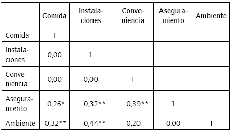 La correlación más alta (r = 0,44) se da entre la dimensión de instalaciones y la de ambiente. Esta relación se entiende consistente, ya que ambas dimensiones hacen referencia al entorno del restaurante: una desde una perspectiva de intangibles y otra desde una perspectiva de tangibles.