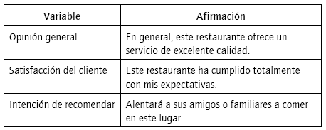 En el mismo levantamiento de datos que en la sección anterior (n = 162), se incluyeron en el cuestionario reactivos para medir tres variables en las que la EMCASER puede tener alguna incidencia. Esto permite, por un lado, examinar un aspecto adicional de la validez de la escala y, por otro, introducirse al análisis de la relación entre la calidad en el servicio en restaurantes y la percepción general de los comensales hacia el mismo. Las tres variables fueron: opinión general hacia la calidad en el servicio del restaurante, satisfacción del cliente e intención de recomendar el restaurante. Cada una de estas variables fue medida a través de un único reactivo en forma de escala de actitud de cinco categorías que van de totalmente de acuerdo a totalmente en desacuerdo, en congruencia con el resto de los reactivos del cuestionario. Las afirmaciones de estos reactivos pueden verse en la tabla 14.