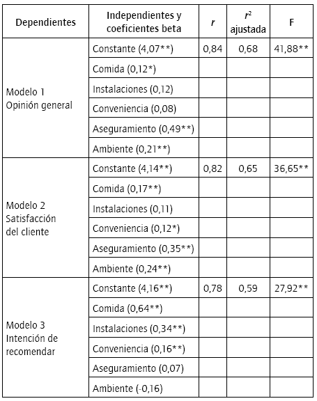 En términos generales, las dimensiones de la escala muestran una relación positiva con las variables dependientes. Asimismo, estas dimensiones tienden a generar un grado de explicación considerable sobre tales variables. No en todos los casos todas las dimensiones muestran una relación significativa con todas las dependientes. Pero cada una de las dimensiones muestra al menos una relación significativa con alguna de estas variables dependientes. Por ejemplo, la dimensión aseguramiento del servicio tiene los coeficientes más altos para explicar tanto la opinión general como la satisfacción y, al mismo tiempo, no logra un coeficiente significativo para explicar la intención de recomendar. Comida es la dimensión que se mantiene con coeficientes significativos de forma más clara como elemento explicador de las tres variables dependientes planteadas.