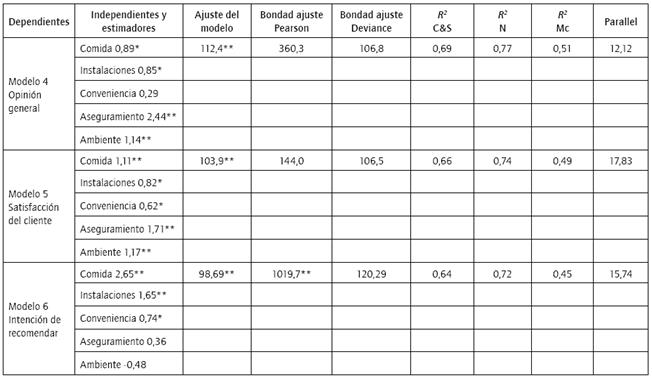 En la tabla 16 se muestran los resultados de los análisis de regresión ordinal para cada una de las variables dependientes. En general, todos los modelos pasan las pruebas estadísticas para ser aceptados. Solo el modelo 6, referente a la intención de recomendar, no pasa una de las dos pruebas de bondad de ajuste de los datos al modelo. También, en general, los resultados de las regresiones ordinales tienden a confirmar los de los análisis de regresión lineal que se muestran en la tabla 15: todas las dimensiones de la calidad del servicio en restaurantes (variables independientes) tienden a tener un efecto positivo significativo en algunas de las variables dependientes del desempeño; conveniencia no muestra un efecto significativo hacia la opinión general; aseguramiento y ambiente no muestran un efecto significativo hacia la intención de recomendar. Con respecto al grado de explicación sobre las variables dependientes, los coeficientes r2 de determinación (que en regresión ordinal se tienen de tres tipos) muestran un comportamiento variado, en algunos casos se obtienen coeficientes más elevados que los coeficientes de determinación de los análisis de regresión lineal y, en otros casos, coeficientes menos elevados.