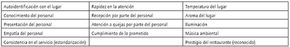 En la tabla 12 se observa que los atributos tangibles se conjuntaron en tres dimensiones, que por su contenido se nombraron comida, instalaciones y conveniencia.