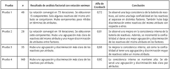 Para ir corrigiendo los reactivos de la escala, se recurrió a varias pruebas empíricas preliminares o pruebas piloto (tablas 4 y 5). En cada prueba empírica se testearon por separado ambas subescalas (tangibles e intangibles) y con los resultados de cada prueba empírica se realizaron análisis factoriales. Cada análisis factorial se llevó a cabo con rotación de tipo varimax, adecuado para este tipo de pruebas, ya que sus algoritmos buscan maximizar la dispersión de los reactivos en los diferentes factores subyacentes obtenidos. Si los tres reactivos que pretenden medir el mismo atributo son adecuados, se espera que estos se junten en un mismo factor. De forma ideal, se esperaría que el análisis factorial arrojara tantos factores subyacentes como atributos se tenían planteados originalmente. En muchos casos no se encontró una separación perfecta debido a que muchos de los atributos no son independientes entre sí, esto es: hay atributos que pueden tener una asociación estadística natural que no permita la separación, sino que ambos atributos se junten en una sola dimensión. Por ejemplo, aunque "higiene de los alimentos" es en origen un atributo distinto a "apariencia del platillo", si un comensal percibe que hay poca higiene en los alimentos, es esperable que no tenga una percepción favorable de la apariencia del platillo. De esta forma, el análisis factorial permite, adicionalmente, identificar las dimensiones en las que se agrupan los atributos -por lo tanto, las dimensiones del instrumento-. En total, se reportan los hallazgos de cuatro pruebas preliminares (piloto). Los resultados de cada piloto se pueden ver en la tabla 4 para la subescala de atributos intangibles y en la tabla 5 para la de atributos tangibles.