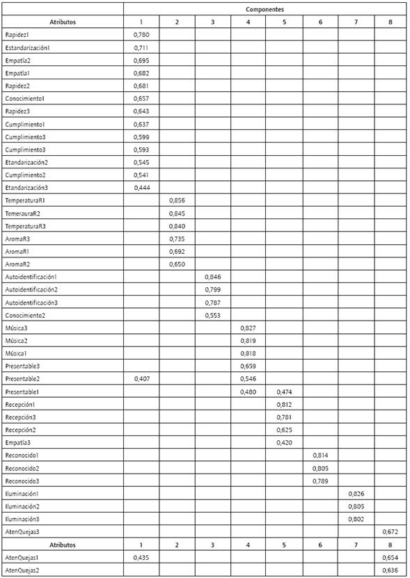 En la tabla 6 se muestra la agrupación de reactivos en factores subyacentes para los atributos denominados aquí como intangibles. Se puede apreciar que se obtienen con nitidez ocho factores. Los tres reactivos por cada atributo tienden a converger en el mismo factor a excepción de los reactivos para los atributos iluminación, empatía y conocimiento. En el caso de estos tres atributos, solo dos de los reactivos respectivos convergen. Los reactivos para rapidez, estandarización, empatía (2), conocimiento (2) y cumplimiento convergen en el mismo factor. Todos estos atributos tienen relación con el personal. Por otra parte, los atributos sobre el lugar físico (temperatura del restaurante y aroma del restaurante) convergen en el mismo factor. Música ambiental y presentación del personal convergen en otro factor. Los reactivos sobre los atributos autoidentificación, prestigio, iluminación y atención a quejas convergen claramente en su propio factor, formando factores unidimensionales. Los reactivos sobre recepción se unen notoriamente en un factor; sin embargo, tienen una ligera carga de otros dos reactivos (uno de personal presentable y otro de empatía). En la tabla 6 también se puede apreciar un resultado factorial lo suficientemente nítido como para aceptar estos reactivos de aspectos intangibles de la calidad en el servicio.