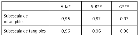 Para corroborar la fiabilidad de las subescalas, se recurrió a tres pruebas: una que mide la confiabilidad general mediante la consistencia en la variabilidad de los reactivos (alfa de Cronbach) y dos (Sperarman-Brown y Guttman) sirven para detectar inestabilidad de los reactivos. Los resultados que se pueden ver en la tabla 8 indican que se tienen indicadores muy buenos tanto de fiabilidad como de estabilidad en cuanto a lo que los reactivos miden (Darren y Mallery, 2003; Gliem y Gliem, 2003). Las pruebas de consistencia interna de mitades divididas como Sperman-Brown, y Guttman son útiles cuando la escala contiene dimensiones múltiples (Hair, Bush y Ortinau, 2010) como en este caso. En la mayoría de los casos, todos los coeficientes de constancia interna comienzan a considerarse satisfactorios a partir de valores de 0,60 hacia arriba (Hair et al., 2010).