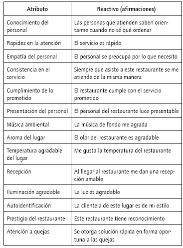 En comparación con otras mediciones propuestas para restaurantes (tabla 1), la EMCASER enfatiza más los atributos tangibles (tabla 10). Este mayor número de atributos se considera relevante debido a la naturaleza del servicio de restaurantes a mesa que, como se argumentó, se ubica en un punto intermedio entre servicio y producto. Se puede interpretar que los enfoques anteriores ubican a este sector más como un servicio, razón por la cual probablemente definieron la mayoría de sus dimensiones sobre aspectos intangibles.