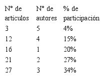 La tabla I muestra que el 34% de las contribuciones de autoría corresponden a publicaciones desarrollas por 3 autores, seguido por el 27% equivalente a 21 artículos escritos por 2 autores y el 20% correspondiente a 16 escritos por 1 autor y el 19% restante que corresponden a 15 artículos de la muestra, que fueron escritos por 4 y 5 autores.