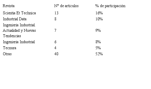 La tabla II permite evidenciar que 13 artículos correspondientes al 16%, fueron publicados en la revista Scientia Et Technica de la Universidad Tecnológica de Pereira - Colombia, 8 artículos correspondientes al 10%, fueron publicados en la revista Industrial Data de la Universidad Nacional Mayor de San Marcos – Perú, 7 artículos correspondientes al 9%, fueron publicados en la revista Ingeniería Industrial, Actualidad y Nuevas Tendencias de la Universidad de Carabobo – Venezuela, 6 artículos correspondientes a un 8%, se publicaron en la revista Ingeniería Industrial del Instituto Superior Politécnico José Antonio Echeverría – Cuba, 4 artículos correspondientes al 5%, fueron publicados por la revista Tecnura de la Universidad Distrital Francisco José de Caldas – Colombia y el resto correspondiente a 40 artículos sumando un 52%, fueron publicados por revistas de Chile, Colombia, Cuba y México con un número de publicaciones entre 1 y 4 artículos y un porcentaje de participación también entre el 1% y el 4%.