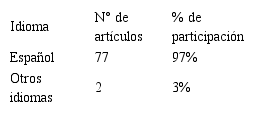 En la contribución por idioma de la tabla III, se puede evidenciar que 77 artículos de la muestra, correspondientes al 97%, fueron escritos en español y 2 artículos en idiomas como el inglés y portugués.