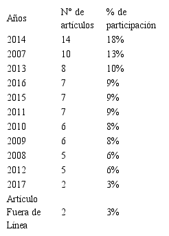 En la tabla IV es posible validar que el mayor número de artículos fue escrito en el 2014 con 14 artículos correspondientes al 18%, seguido del 2007 con 10 artículos correspondientes al 13%, continuando con el 2013 con 8 artículos correspondientes al 10%, 2011, 2015 y 2016 cada uno con 7 artículos equivalentes al 9% y el resto de los 24 artículos correspondientes al 30% fueron escritos entre el 2008, 2009, 2010, 2012 y 2017 sumando a esta cifra 2 artículos que se encuentran fuera de red correspondientes al 3%.
