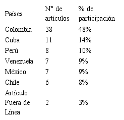 Como se puede observar en la tabla V, el mayor número de artículos fue escrito en Colombia con un 48% equivalente a 38 artículos, seguida por Cuba con un 14% correspondiente a 11 artículos, Perú con un 10% equivalente a 8 artículos, México y Venezuela con un 9% que suman 7 artículos cada uno, Chile con un 8% equivalente a 6 artículos, y finalmente con 2 artículos de los 79 que se encontraban fuera de red al momento de la consulta.