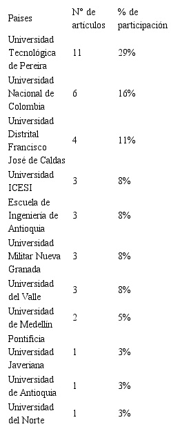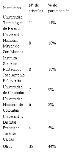 La tabla VII permite evidenciar que 11 de los 79 artículos fueron escritos por la Universidad Tecnológica de Pereira – Colombia, 8 de los artículos fueron escritos por el Instituto Superior Politécnico José Antonio Echeverría – Cuba y la Universidad Nacional Mayor de San Marcos – Perú cada uno, 7 de los artículos fueron escritos por la Universidad de Carabobo – Venezuela, 6 por la Universidad Nacional de Colombia, 4 por la Universidad Distrital Francisco José de Caldas y el resto de instituciones tienen entre 1 y 3 artículos cada una que suman el 44% acumulado para un total de 35 artículos.